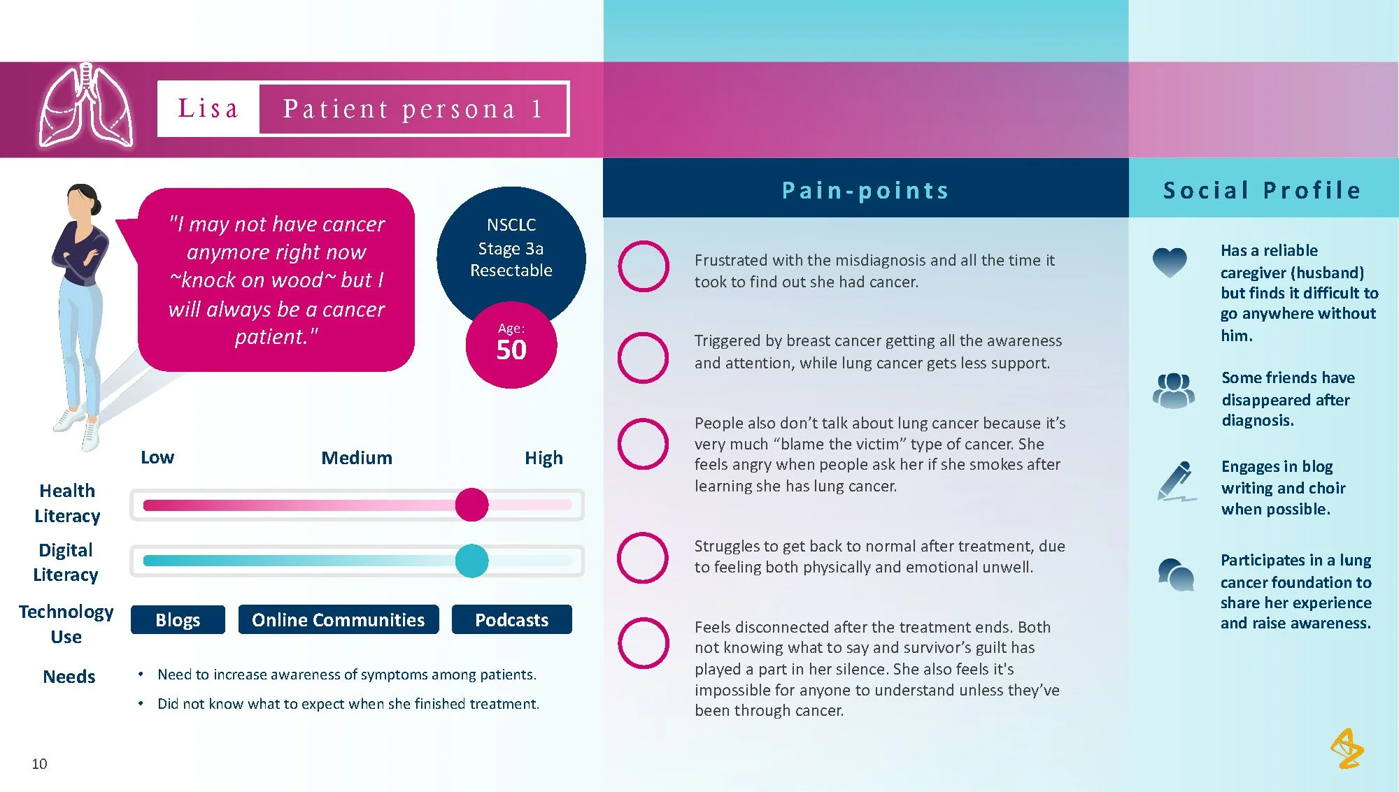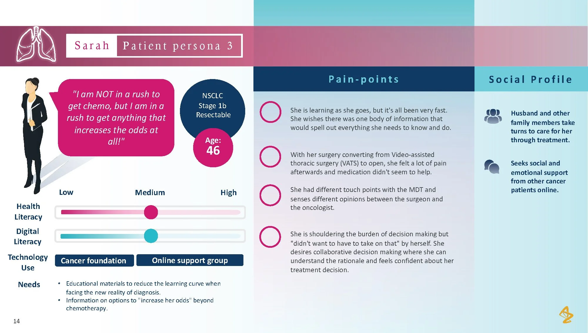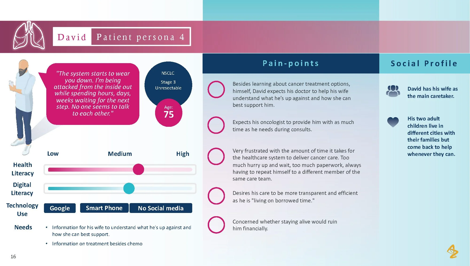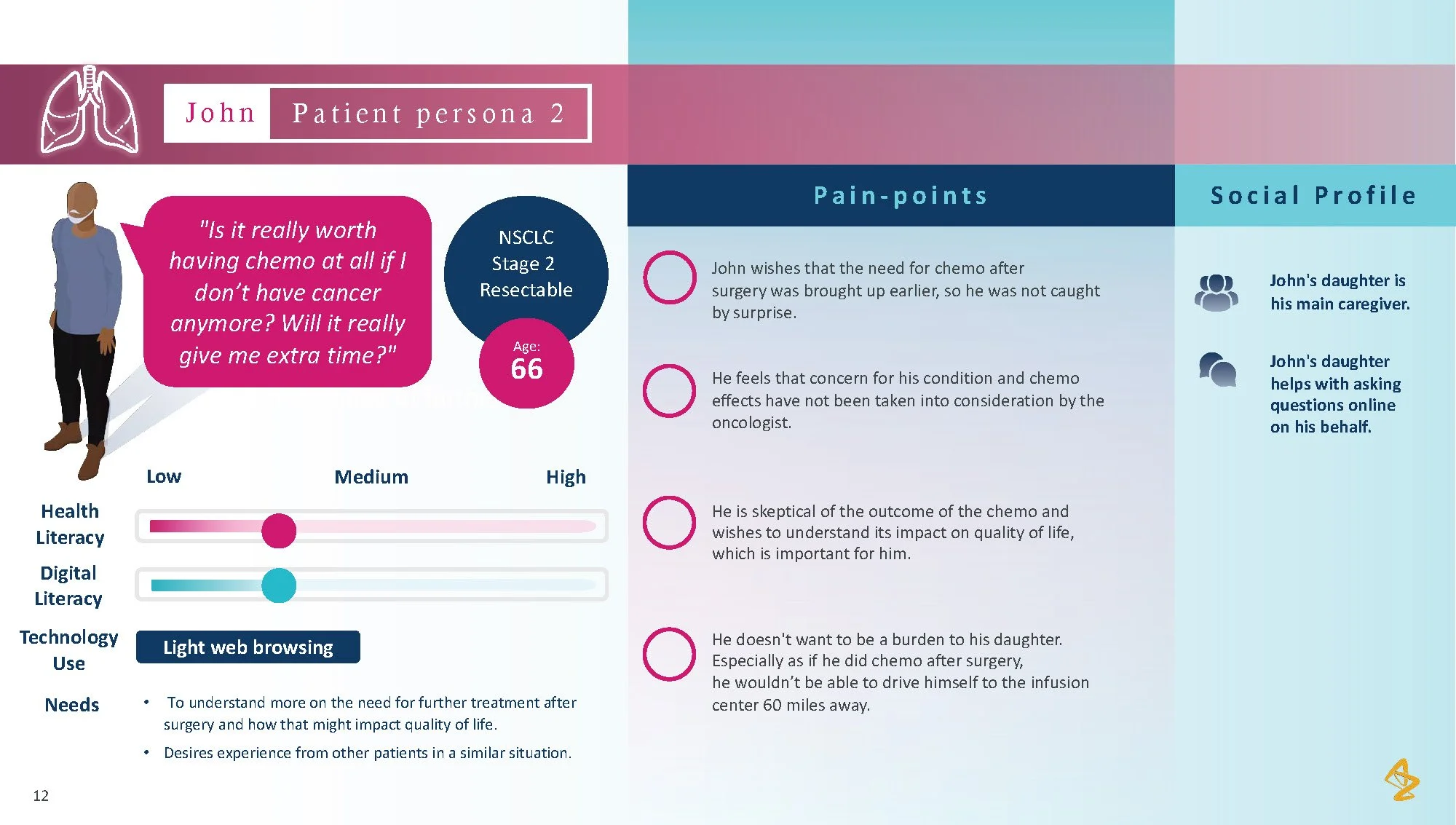 Consumer tension: Patients with lung cancer face overwhelming choices and limited personalized advice, making it difficult to feel confident in their treatment path. The lack of individualized information and support from their healthcare providers leaves patients uncertain and disconnected from their care process.